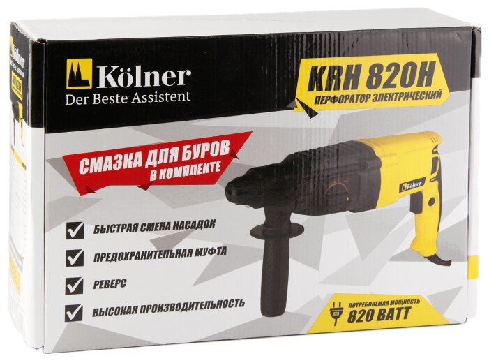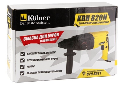 Перфоратор KOLNER KRH 820H: Напряжение/частота: 220 В ± 10%/50 Гц. Потребляемая мощность: 820 Вт. Энергия удара: 2,5 Дж. Число оборотов на холостом ходу: 0-1300 об/мин. Частота ударов: 0-5500 уд/мин. Режим работы: сверление/ сверление с ударом/долбление. Патрон: SDS-plus. Максимальный диаметр сверления: дерево - 38 мм, бетон - 26 мм, металл - 13 мм. Длина сетевого кабеля: 2 метра. Масса: 3,1 кг.