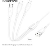 Дата-кабель Borofone BX71 представляет собой USB кабель с тремя выходами: Lighting 8-pin, USB Type-C и micro USB. Он позволит заряжать или синхронизировать с ПК одновременно три разных устройства. Выполнен кабель из высококачественных материалов, потому прослужит очень долго. Кабель находится в прочной оплетке, которая предотвратит перетирание или перегибание кабеля по длине и возле коннекторов.