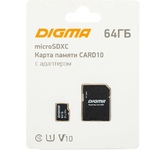DIGMA Карта памяти microSDXC UHS-I U1 64 ГБ, 70 МБ/с, Class 10, CARD10, 1 шт., переходник SD [dgfca0