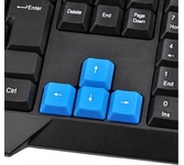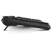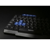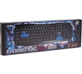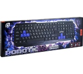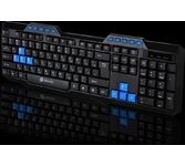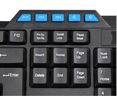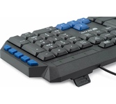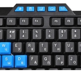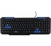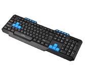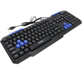 Клавиатура игровая, проводная, мультимедийная, количество клавиш: 114, дополнительных - 10, часто используемые клавиши - выделены голубым цветом, интерфейс USB, корпус клавиатуры - имеет изогнутую форму, ножки прорезинены, длина кабеля: 1,5 м, размер: 450 x 155 x 25 мм.