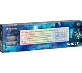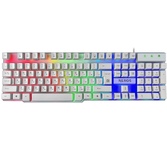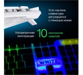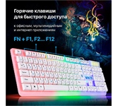 Стильная белая проводная игровая клавиатура с радужной подсветкой. Клавиатура имеет полноразмерную раскладку, а также возможность управления мультимедийными программами с помощью кнопки FN.