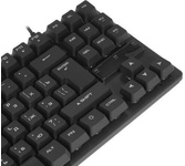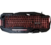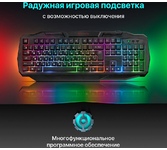 Клавиатура геймерская, проводная, интерфейс USB, специальные игровые функции: блокировка системных клавиш Windows и переключение стрелок курсора на кнопки WASD*, 3 цвета подсветки, клавиши быстрого доступа, регулируемая яркость и частота опроса, металлическое дно, ферритовый фильтр помех.