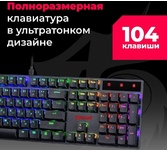 Распознает одновременное нажатие 104 клавиш Точная и тихая тактильная отдача обеспечивается низкопрофильными разделенными клавишами Программируемая RGB подсветка Влагоустойчивая конструкция клавиатуры Аппаратная блокировка клавиши WIN во время игры Механические переключатели OUTEMU Red