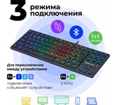 Ультратонкий дизайн 3 режима подключения - Проводное подключение, беспроводной режим Bluetooth, беспроводное подключение по радио каналу 2.4 ГГц Высокая энергоэффективность Тихий ход клавиш обеспечивает практически бесшумную работу Повышенная износостойкость Позолоченный USB-коннектор - Позолоченное напыление обеспечивает лучшую проводимость, меньшее сопротивление и окисляемость RGB подсветка Индикатор заряда аккумулятора Встроенный аккумулятор Совместимость с ПК, ноутбуками, игровыми консолями, смартфонами, планшетами