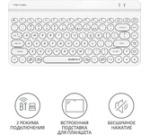 Интерфейс: USB. Тип беспроводного соединения клавиатуры: Bluetooth/Радиоканал. Мультимедийные дополнительные клавиши: есть. Обычная/тонкая: тонкая(slim). Клавиатура с русскими буквами: ДА. Особенности: Клавиатура поддерживает два режима подключения - по беспроводной технологии Bluetooth и с помощью USB-ресивера 2,4 ГГц, и работает на удалении до 10 м, обеспечивая быструю передачу данных без задержек.. Дизайн клавиш: круглые. Радиус действия клавиатуры: 10. Количество элементов питания: 1. Тип элементов питания: АА. Максимальное время работы: 24 месяца. Цвет английских букв: серый. Цвет русских букв: серый. Материал корпуса: пластик. Тип соединения: беспроводная. Количество клавиш: 86. Габариты упаковки (ед) ДхШхВ: 0.36x0.2x0.03. Вес упаковки (ед): 0.6. Комплектация: клавиатура, nano-ресивер, батарея АА, кабель-удлинитель USB, руководство пользователя. Гарантия: 12 мес.. Размеры клавиатуры (ШхВхТ): 315 х 24 х 155 мм. Цвет: и белый. Конструктив клавиатуры: островная. Тип соединения: беспроводная. Беспроводной и