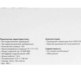 Общие характеристики Бренд ACER Модель OKW122 Тип соединения проводная Интерфейс USB Длина кабеля 1.5 м Клавиши клавиатуры Клавиши островного типа да Дизайн клавиш квадратные Клавиатура с русскими буквами ДА Цвет русских букв красный Цвет английских букв белый Количество клавиш 104 Конструкция клавиатуры Обычная/тонкая обычная Комплектация Полную комплектацию товара уточняйте у производителя Размеры, цвет Цвет черный Материал корпуса пластик Размеры клавиатуры (ШхВхТ) 439 х 29.5 х 125.8 мм Вес 0.405 кг