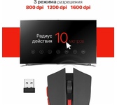 Мышь беспроводная, износостойкое UV-покрытие с эффектом Metallic; бесшумные клавиши; подходит для использования как правой, так и левой рукой; 3 уровня DPI: 800, 1200, 1600; радиус действия - до 10 м; 1 батарейка АА в комплекте.