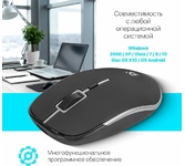 3 режима разрешения мыши 800/1200/1600 dpi Точный и надёжный сенсор Pixart 3065 Бесшумное нажатие кнопок 2 дополнительные боковые кнопки Кнопка смены разрешения Широкое прорезиненное колесо прокрутки шириной 8 мм с подсветкой Прочные тефлоновые ножки легко скользят по поверхности стола - Аккуратно снимите защитную пленку с тефлоновых ножек перед использованием Эргономичная форма Радиус действия - 10 м Специальный отсек в корпусе мыши для хранения приемника Многофункциональное программное обеспечение - Работает только с операционной системой Windows
