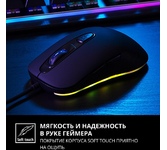 Геймерская мышь со стильным дизайном и атмосферной RGB подсветкой (5 режимов). Игровой сенсор с изменяемым DPI (6 уровней 800-1600-2400-3200-4800-7200). Большой размер и 3 боковые кнопки для удобства игрока. Размеры 119x63x38 мм. Вес 55 г (без кабеля). Лучший выбор для игровых марафонов