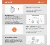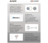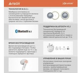 Конструкция Бренд A4TECH Модель B20 TWS Крепление в ушной раковине Тип конструкции вкладыши Тип соединения беспроводные bluetooth Переключатель треков есть Кнопка ответа вызова есть Акустические характеристики Тип, акустический закрытые Тип звукоизлучателя гибридный Количество драйверов 1 гибридный Диаметр головок излучателей 13 мм Импеданс 32 Ом Чувствительность 102 дБ Диапазон воспроизводимых частот от 20 Гц до 20 кГц Характеристики микрофона Крепление микрофона встроенный Диапазон частот микрофона от 100 Гц до 10 кГц Чувствительность микрофона -42 дБ Подключение Подключение Bluetooth Версия Bluetooth v.5.2 Радиус действия 10 м Питание Зарядка от USB есть Емкость аккумулятора наушников 40 мAч Время работы 5 ч Время зарядки наушников 1.5 ч Емкость аккумулятора чехла 380 мAч Время работы с чехлом 20 ч Тип зарядного чехла проводной Разъем питания зарядного чехла USB Type-C В комплекте Чехол для транспортировки в комплекте Цвет, вес Цвет белый Размер зарядного чехла 63 х 52 х 26 мм