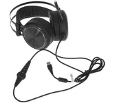 Гарнитура проводная, объемный звук 7.1, чувствительность микрофона - 38 дБ, чувствительность динамика -119 дБ, частотный диапазон - 20Гц-20КГц, тип соединения гарнитуры - USB, гибкий микрофон, управление звуком и подсветкой на проводе, длина кабеля - 2,2 м.