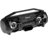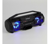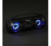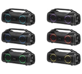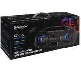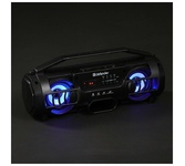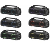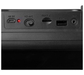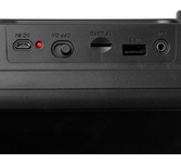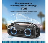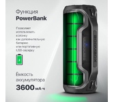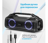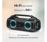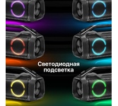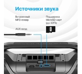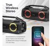 Акустика, суммарная выходная мощность (RMS): 50 Вт Звуковая схема: стерео, 2.0 Диаметр НЧ динамика: 2 x 3,5 " Акустическое оформление: с пассивным излучателем True Wireless Stereo (TWS): есть Диапазон частот: 80–12000 Гц Соотношение сигнал/шум: 85 дБ Влагозащищенный корпус: IPX5 Время работы от аккумулятора: 4 час Время зарядки аккумулятора: 5-9 час Интерфейс: AUX-аудиовход Подсветка: светодиодная Интерфейс беспроводной связи: Bluetooth 5.0 Дальность действия: 10 м Питание: от USB, 5 В, Li-Ion аккумулятор Емкость аккумулятора: 3600 мА·ч Тип элементов питания: 18650 Поддержка карт памяти Micro-SD: есть Максимальный поддерживаемый объем карты памяти MicroSD: 32 ГБ Форматы воспроизведения аудио: WAV, FLAC, MP3, WMA, APE Встроенный пассивный излучатель: есть Материал корпуса: пластик Размеры без упаковки: 13.0 x 17.5 x 39.0 см Размеры индивидуальной упаковки: 16.3 x 19.0 x 42.5 см Гарантийный срок: 6 месяцев Цвет: чёрный ROHS / CE: Да