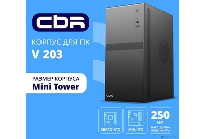 [Корпус] CBR Корпус mATX Minitower V203, без БП, 1*USB 3.0, 1*USB 2.0, HD Audio+Mic, Black [PCC-MATX-V203-WPSU]