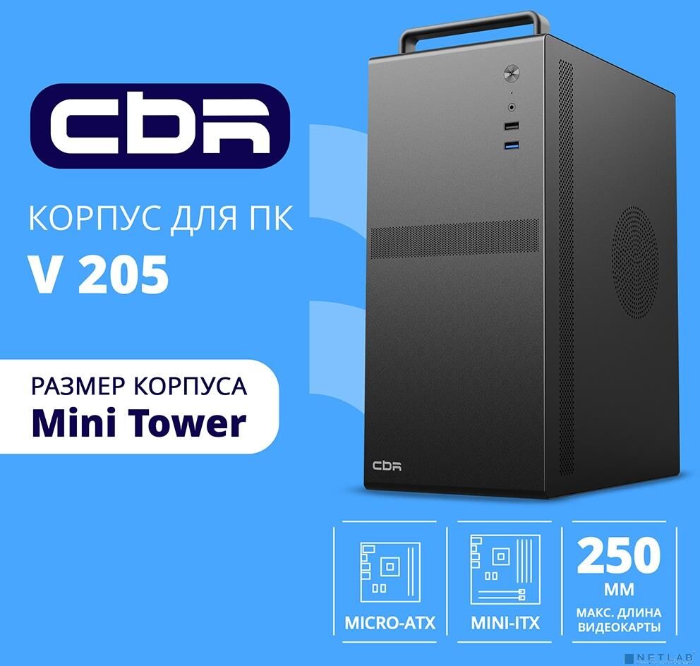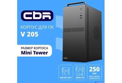 [Корпус] CBR Корпус mATX Minitower V205, без БП, 1*USB 3.0, 1*USB 2.0, HD Audio+Mic, ручка, каркас металл 1.8мм, Black [PCC-MATX-V205-WPSU]