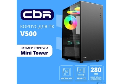 [Корпус] CBR Корпус mATX Minitower V500, без БП, 1*USB 3.0, 2*USB 2.0, HD Audio+Mic, закаленное стекло, Black [PCC-MATX-V500-WPSU]