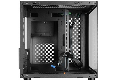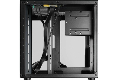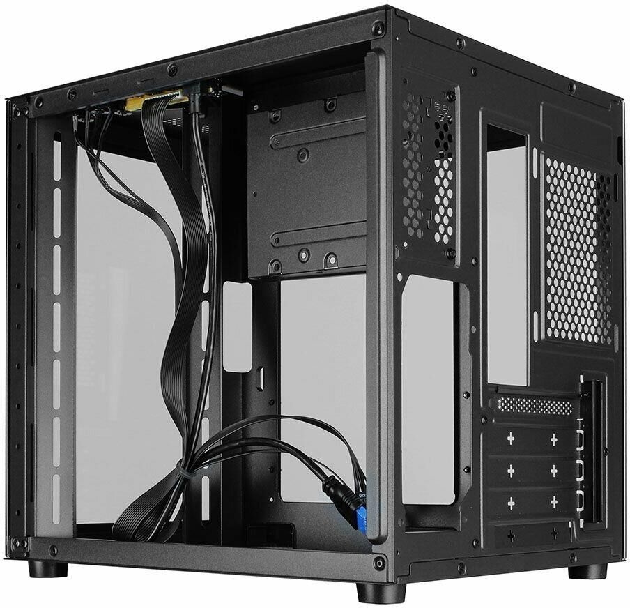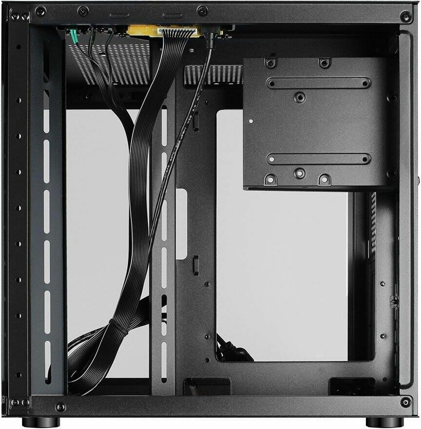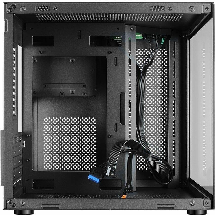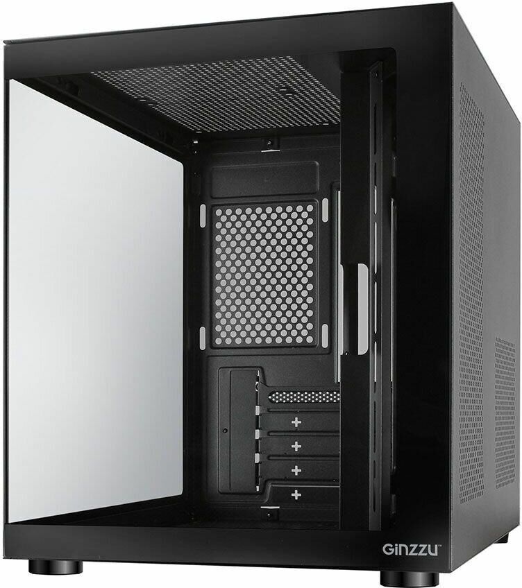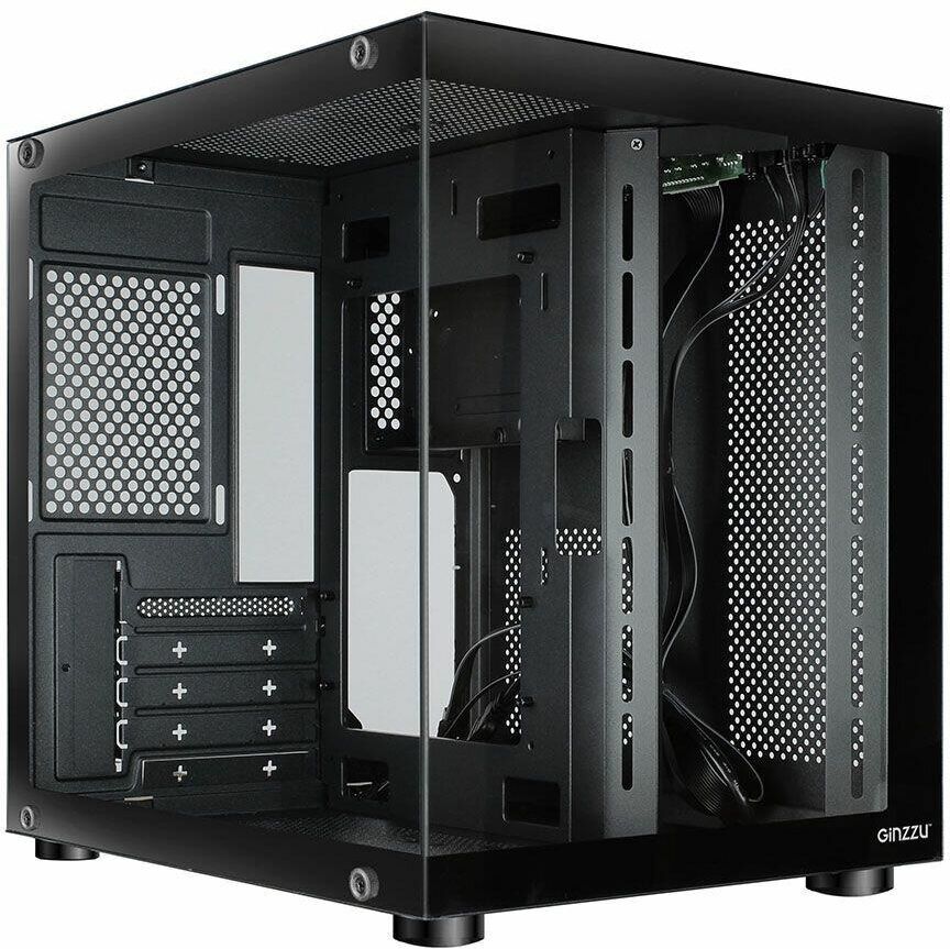 Компьютерный корпус Ginzzu V100 формат mATX Прочное шасси из стали черного цвета 0,5 мм. Поверхности корпуса выполнены из закаленного стекла. Уникальный дизайн в виде стеклянного куба. Совместимые мат. платы размером не более 244*244мм формата micro-ATX или mini-ITX Имеются посадочные места под 1*HDD и 1*SSD Оригинальная конструкция кабель менеджмента и расположения БП. Съемная корзина для жестких дисков.