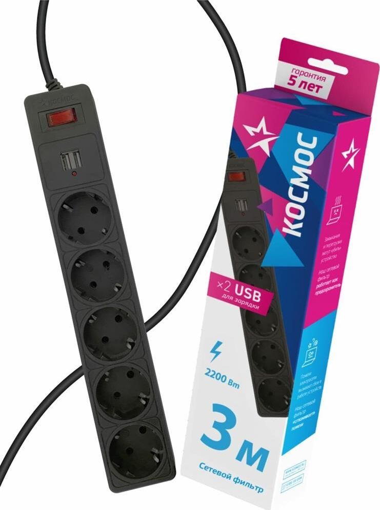Сетевой фильтр(варистор,терморазмыкатель),3м, на 5 гнезд с заземлением, сечения провода - 3*0,75мм2,Медь 100%,Индикатор сети. Номинальный ток 10А, максимальная мощность - 2200Вт.