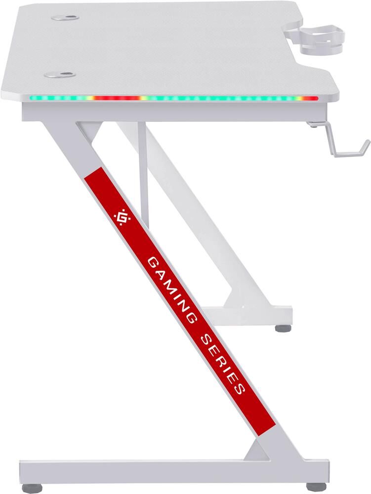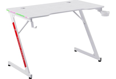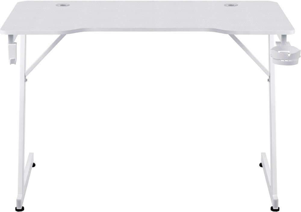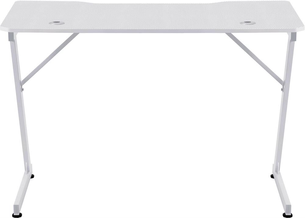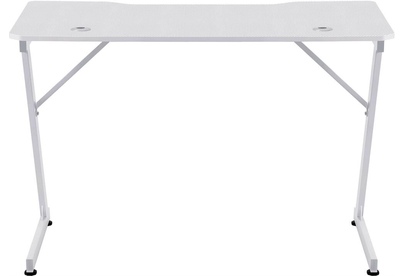 Стильный игровой стол в белом цвете с прочными металлическими ножками. Столешница выполнена из МДФ и покрыта прочной меламиновой пленкой с текстурой "под карбон". В комплект входят держатели для гарнитуры и кружки, в столешнице предусмотрены 2 выхода для проводов. Длина столешницы 110 см.