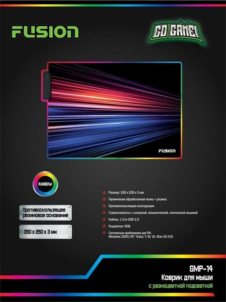 Коврик для мыши с RGB подсветкой, USB 2.0 Размер: 350 мм * 250 мм * 3 мм Термически обработанная ткань + резина Противоскользящая конструкция Подсветка: RGB Кабель : 1,5М USB 2.0 Совместимость: с лазерной, механической, оптической мышкой