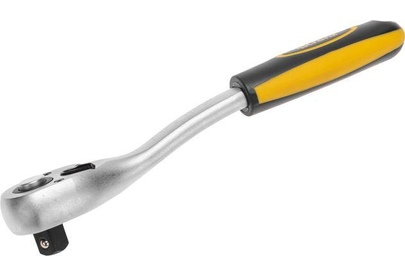 Ключ-трещотка для торцовых головок KRANZ предназначен для закручивания и раскручивания резьбовых соединений. Инструмент обладает высоким рабочим ресурсом. Оснащен цельнометаллическим корпусом с хромированной поверхностью. Изогнутая форма рукоятки создает дополнительное удобство при закручивании и раскручивании соединений, находящихся в труднодоступных местах. Прорезиненная рельефная рукоятка удобно лежит в руке в процессе работ. Инструмент служит для работы с торцевыми головками, которые соединяются при помощи посадочного квадрата 1/2 дюйма с подпружиненным шариковым фиксатором. Длина изделия – 260 мм. Количество зубьев – 72 шт. Материал изготовления – сталь СrV.