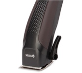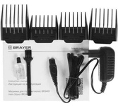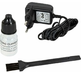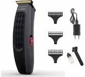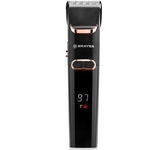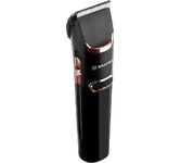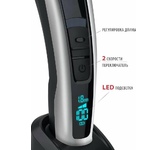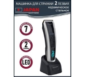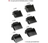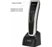 Фиксированные лезвия из высококачественной стали с титановым покрытием. Керамические подвижные лезвия . Установка длины на корпусе 1.0 мм., 1.3 мм., 1.6 мм., 1.9 мм. 4 съёмные насадки 3 мм., 6 мм., 9 мм., 12 мм. Турборежим. Время зарядки 1,5 часа. Время непрерывной работы 1 час LED-дисплей. Индикация уровня заряда. Возможность работать от сети и от аккумулятора. База для зарядки. Литиевая батарея: 1*700 мАч. Аксессуары: щёточка, смазочное масло. Мощность 3 Вт. Электропитание: 220-240 В., ~50-60 Гц.