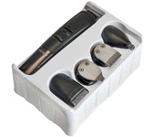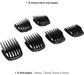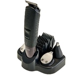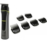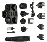 Набор для стрижки и бритья 5 в 1. Потребляемая мощность 5 Вт, Время непрерывной работы до 90 минут, Время заряда аккумуляторной батареи 90 минут, Температура эксплуатации от +5°С до +35°С, Лезвия из нержавеющей стали, LED-дисплей, 2 режима работы: от сети питания и от аккумулятора, Тип аккумуляторной батареи: 14500 Li-ion 3,7 В 600 мА-ч, 5 съемных насадок:насадка-бритва, насадка для коррекции и дизайнерской стрижки, насадка для носа и ушей, насадка стандартный триммер, насадка узкий триммер для подравнивания. Щеточка для чистки лезвий, Подставка для хранения набора.