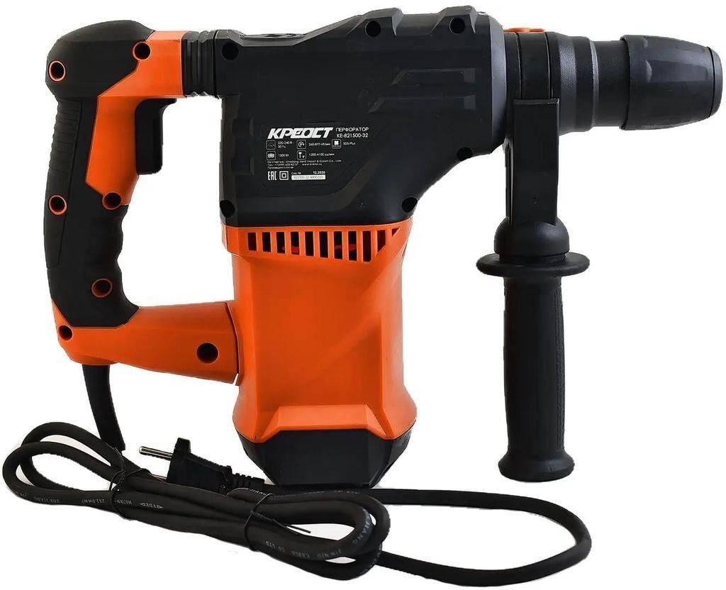 Потребляемая мощность: 1500. Количество скоростей: 6. Наличие функции "сверление": есть. Наличие функции "сверление с ударом": есть. Наличие функции "удар без сверления": есть. Максимальная энергия удара: 4.5. Количество патронов в комплекте: один. Тип основного патрона: SDS-plus. Максимальный диаметр сверления (сталь): 20. Макс. диаметр сверления полыми коронками: 100. Максимальный диаметр сверления (дерево): 32. Наличие функции "реверс": есть. Наличие предохранительной муфты: есть. Встроенный фонарик: нет. Дополнительная рукоятка: есть. Ограничитель глубины сверления: есть. Жесткий кейс в комплекте: есть. Особенности: Электрический перфоратор Креост KE-821500-32 питается от сети. Имеет ограничитель глубины сверления и D-образную рукоятку. Устройство предназначено для работ по дереву, бетону и металлу. Модель поддерживает три режима работы: долбление, сверление и сверление с ударом.. Вес инструмента: 5. Длина сетевого кабеля: 2. Длина инструмента: 390. Высота инструмента: 320. Комплект поставки: Перфоратор,