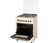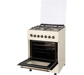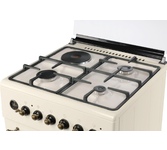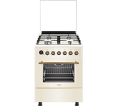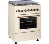 ШхГхВ: 60х60х88,5 см; 4 газовые конфорки; полный газ-контроль; автоподжиг; решетка: чугунная; газовая духовка: 63 л; 2 режима; подсветка; гриль; энергосберегающее стекло дверцы духовки; механический термометр для духовки; отделение для хранения посуды; таймер ("часы"); 2 противня, 1 хромированная решетка; крышка: стекло; цвет: бежевый