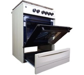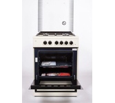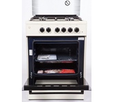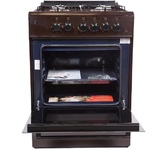 Горелки стола: Газовые – 4 шт. Выдвижной ящик для посуды. Мощность горелок рабочего стола: Горелка передняя левая/правая – 2,0/2,4 кВт. Горелка задняя левая/правая – 2,0/1,0 кВт. Электрический духовой шкаф. Объем духовки в литрах: 65 л. Верхний/нижний нагреватель духовки – тен.Решетка рабочего стола – сталь. Крышка рабочего стола – стекло. Термометр духовки. Кнопка электророзжига горелок стола. Электрическая подсветка духовки. Противень – 2 шт. В/Ш/Г 850/600/600