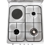 Горелки стола: Газовые – 4 шт. Газ.Контроль - рабочего стола. Мощность горелок рабочего стола: Горелка передняя левая/правая – 2,0/2,4 кВт. Горелка задняя левая/правая – 2,0/1,0 кВт. Электрический духовой шкаф. Объем духовки в литрах: 65 л. Верхний/нижний нагреватель духовки – тен.Решетка рабочего стола – сталь. Крышка рабочего стола – стекло. Термометр духовки. Кнопка электророзжига горелок стола. Электрическая подсветка духовки. Противень – 2 шт. В/Ш/Г 850/500/570