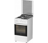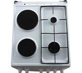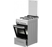 (ШхГхВ)50х60х85см. Цвет белый.Объем духовки, л.50.Количество конфорок 4. Газовые горелки стола 2.Электроконфорки (1кВт) 2.Электрическая духовка. Количество режимов духовки 4.Интегрированный электрический розжиг горелок стола.Терморегулятор.Подсветка.Выдвижной ящик.Регулируемые опоры. Крышка стеклянная.