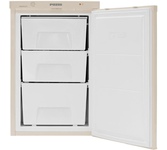 Отдельностоящий морозильник Общие данные: Размеры: высота: 86 см ширина: 54,5 см глубина: 57 см Общий объем: 90 л Тип управления: механический Класс энергопотребления: A+ Климатический класс: SN-ST (от +10°С до +38°С) Годовое потребление энергии: 160 кВтч Цвет: белый Морозильное отделение: Ручная разморозка Технология охлаждения: Low frost Диапазон температур: ниже -18° Количество выдвижных ящиков: 3 Дополнительная информация: Вес нетто (кг): 25 Хладагент: R600a / 47 гр. Skin condenser Опорные ножки/колеса: 2 Кабель питания: 1.4 м Напряжение/Частота: 220~240 В / 50 Гц Боковая утопленная ручка Уровень шума дБ (А): 37 Перенавешиваемые двери Передние/задние регулируемые ножки