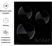 (ШхГхВ)45х52х5.50 см.Цвет черный.Тип поверхности: индукционная независимая. Количество зон нагрева: 3.Нагревательные элементы: 3 элемента индукционного нагрева.Управление: сенсорное слайдерное (Touch Slider).Расположение управления: спереди.Режимы нагрева: 9 ступеней мощности.Таймер: отключения на каждую зону 1-99 мин.Усилитель нагрева Booster: есть.Автоматическое отключение: есть.Защита от перегрева: есть.Блокировка управления от детей: есть.Защита от перелива: есть.Индикаторы остаточного тепла: есть.