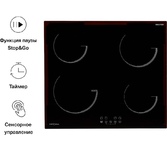Нагревательные элементы: индукционного нагрева Цвет: Черный Материалы: стеклокерамика Линейка: Racio Срок службы: 7 лет Преимущества: * Усилитель нагрева Booster на 1 зону * Функция паузы Stop&Go * Автоматическое определение наличия посуды Ширина встраивания, мм: 600 Встраиваемая часть (В*Ш*Г), мм: 58*557*487 Ниша для встраивания (В*Ш*Г), мм: 35 min*560*490 Лицевая панель (В*Ш*Г), мм: 4*590*520 Минимальная толщина столешницы, мм: 35 Расположение управления: фронтальное, спереди по центру Управление: сенсорное (Touch Control) Количество конфорок: 4 Количество режимов нагрева: 9 Количество зон расширения: 1 Таймер: 1-99 мин. Защита от перелива: да Дисплей: цифровой Индикаторы остаточного тепла: да Защита от перегрева: да Диаметр, мм и мощность зон нагрева передняя левая, кВт: 210 мм, 1,8/2,2 кВт Максимальная потребляемая мощность, кВт: 6.8 Диаметр, мм и мощность зон нагрева задняя левая, кВт: 160 мм, 1,4 кВт Диаметр, мм и мощность зон нагрева задняя правая, кВт: 180 мм, 1,8 кВт Диаметр, мм и мощность зон нагрев