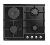 Газовая варочная поверхность, ширина 60 см, 4 газовые конфорки, общая мощность 8,0кВт, диаметр конфорок 50 мм, 2Х70мм и 80 мм, мощность малой конфорки 1 кВт, мощность средних конфорок 1,7 кВт, мощность большой двухконтурной WOK конфорки 3,6 кВт, фронтальные поворотные регуляторы, электроподжиг, эмалированная решетка, материал поверхности -матовая эмаль, цвет - черный. В комплекте переходники на сжиженый газ. Длина кабеля питания, 1,2 м