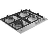 Газ на металле; 4 высокоэффективные конфорки; 60см; одна зона с двойным уровнем пламени; автоподжиг; газ-контроль; чугунные решетки; Расположение панели управления фронтальное; Цвет: Нержавеющая сталь