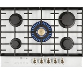 ШхГхВ: 70*51*10 см, Электроподжиг, Газконтроль, Сенсорный таймер отключения газа индивидуальный для каждой конфорки, Чугунная решетка, WOK конфорка, Поверхность: белое закаленное стекло, 2 комплекта ручек: серебристные, ретро