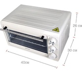 Объем 25 л. Цвет серый. Мощность 1500 Вт. Таймер отключения 60-120 мин. Количество режимов работы - 3. Два терморегулятора на каждый тэн отдельно от 70 до 250 ℃ . Тип очистки: эмаль легкой очистки. Комплектация: решетка; противень прямоугольный; ухват. Габариты изделия: 500x366x290 мм. Габариты упаковки: 530x385x355 мм Вес нетто/брутто (кг): 7,2 / 8,8 кг