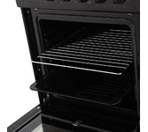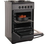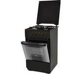 (ВхШхГ) 85х50х60см. 4 газ. конфорки. Электроподжиг конфорок. Духовка газовая. Объем 57л. Газ контроль духовки. Очистка духовки традиционная. Подсветка духовки. 2 стекла дверцы духовки. Материал рабочей поверх-ти эмаль. Цвет черный. Без крышки.