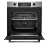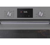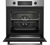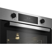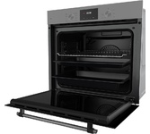 Электрический духовой шкаф; 6 режимов; LED дисплей; утапливаемые поворотные переключатели; система очистки паром; металлические направляющие; объем - 72л; 2 стекла дверцы; 1 решетка; 1 противень; Цвет: Нержавеющая сталь; Материал панели управления: Металл