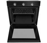 Духовой шкаф с механическим управлением, панель управления - стекло, 10 режимов, утапливаемые регуляторы, механический таймер, объем духовки 77 л, двухслойное остекление, очистка камеры Steam cleaning, режим быстрого нагрева, автоматическое отключение, одноуровневые телескопические направляющие, эмаль легкой очистки, в комплекте: глубокий противень и хромированная решетка, цвет: черное стекло