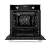Стильный электрический встраиваемый духовой шкаф MAUNFELD MEOC708PBG — это сочетание высокого качества сборки, эксклюзивного дизайна и расширенного функционала. Объем 70 л при стандартных размерах 60 см позволяет готовить одновременно несколько блюд, разместив решетку или противень на одном из 5 уровней боковых направляющих. Внутреннее покрытие камеры выполнено из специальной легкоочищающейся эмали черного цвета. Дверца духового шкафа состоит из 2-х стекол, что создает холодный фронт и делает процесс приготовления безопасным, исключая возможность ожога при касании. Внутреннее стекло с тонировкой позволяет создавать визуальный эффект однотонности стекла, благодаря этому не видно содержимого духовки при выключенном внутреннем освещении. Фронтальная панель духовки и фасад ручки дверцы сделаны из высококачественного жаропрочного стекла белого цвета, окрашенного по всему объему, что является отличительной чертой бытового прибора премиум-класса. Механическое управление духовки осущест