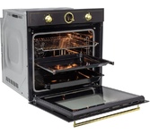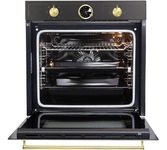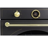 Духовой шкаф Maunfeld EOEFG.566RBG.MT выполнен в черном цвете с золотистой фурнитурой и станет отличным дополнением на кухни в ретро дизайне. 7 рабочих функций позволяют готовить блюда как при помощи традиционного нагрева, так и используя гриль или конвекцию. Внутреннее покрытие камеры покрыто специальной эмалью, которая способствует расщеплению осевшего на стенки жира. Ключевые преимущества: Тангенциальное охлаждение Цельнометаллические ручки управления Черная эмаль легкой очистки