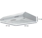Цвет корпуса - белый,Мощность - 105Вт,Размеры вытяжки (ШхГхВ) - 598х470х100,Максимальный уровень шума (dB) - 52,Подсветка - 1 x E14 25W,Диаметр выхода - 120мм,Управление - кнопочное ,Тип фильтра - фильтр угольный №1