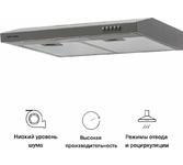 Общие данные: Габариты: 17.6х60х28 см Максимальная производительность: 520 м³/ч Освещение: светодиодное Уровень шума: 56 дБ Полная потребляемая мощность: 102 Вт Режимы работы: отвод/циркуляция Управление: механическое Управление и функции: 2 скорости Дополнительная информация: Диаметр воздуховода: 120 мм Площадь кухни: до 20 кв.м В комплекте: Алюминиевый фильтр, переходник, инструкция по эксплуатации на русском языке. Угольный фильтр приобретается отдельно