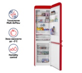 Холодильник Maunfeld MFF186NFRR — это современное и функциональное решение для хранения продуктов питания с элегантным дизайном и высокими техническими характеристиками. Прибор выполнен в красном цвете, обладает современным дизайном в ретро-стиле, который прекрасно дополнит классический или кантри интерьер. Полезный объем холодильного отделения 180 л обеспечивает достаточно места для хранения разнообразных продуктов питания и напитков. Морозильная камера −70 л, оснащена 3 корзинами. Система No Frost в обоих отделениях предотвращает образование льда и. Вы больше не будете тратить время на ручное размораживание, а продукты останутся свежими и вкусными. Благодаря технологии Multi Air Flow, вентиляция обеспечивает равномерное распределение холодного воздуха внутри, сохраняя стабильную температуру и свежесть продуктов на каждой полке. Прибор оснащен инновационной системой охлаждения Twin Cooling и предлагает раздельный контроль температуры для холодильной и морозильной камер. Вы сможете настроить