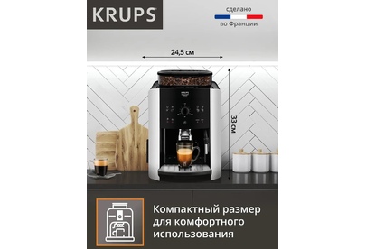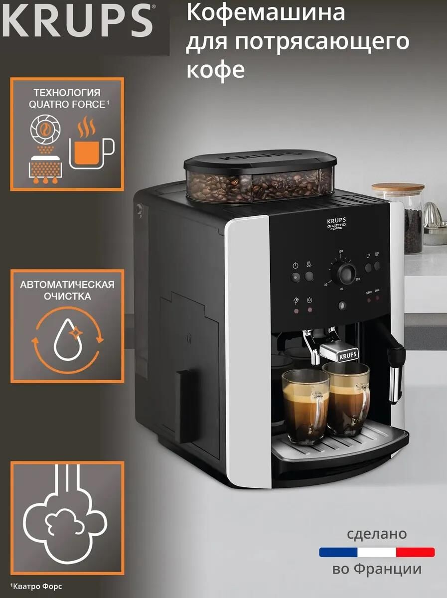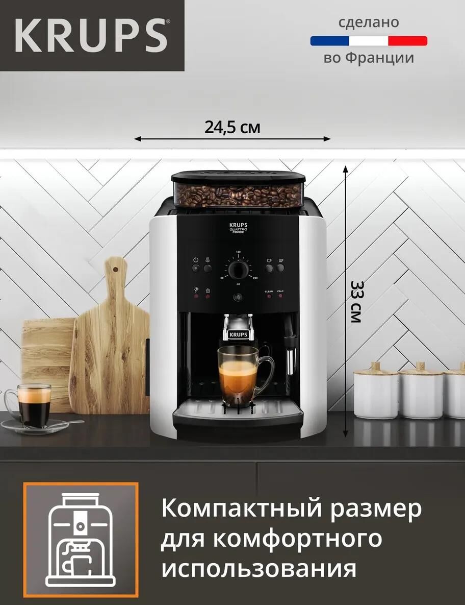 Автоматическая кофемашина Krups Arabica EA811810 с ручным капучинатором - кофемашина с бескомпромиссными стандартами качества, которая приготовит насыщенный и глубокий кофе легко и быстро. Попробуйте великолепный и максимально насыщенный вкус одним касанием, благодаря встроенной в кофемашину технологии Quattro Force, обеспечивающей раскрытие настоящего вкуса кофе в его истинном проявлении и приготовление потрясающих кофейных напитков с богатым ароматом. Откройте для себя удобство во все с электрической компактной домашней зерновой кофемашиной с большим резервуаром для воды. Эспрессо или кофе с молоком – любой напиток будет вдвойне вкуснее в уюте вашего дома с маленькой кофемашиной с высочайшей работоспособностью. Уникальная система Крупс Quattro Force оптимизирует каждый этап приготовления кофе от зерен до последней капли в кружке для получения превосходного кофе. Регулировка степени помола позволит вам изменить выбранный напиток по вашему вкусу – от крепкого и насыщенного эспрессо до мягкого кофе лонг, а кон