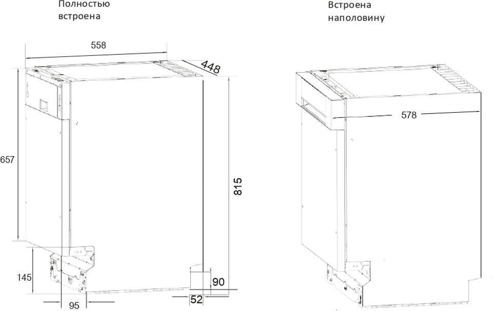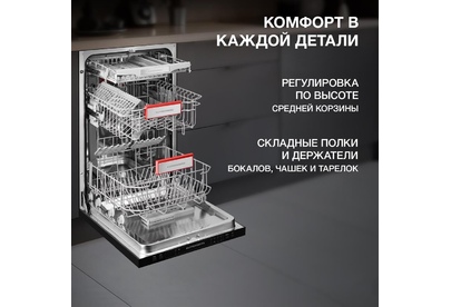 Тип установки: полностью. Загрузка, комплектов посуды: 11. Тип управления: электронное. Количество программ мойки: 9. Максимальный уровень шума: 49. Максимальный расход воды: 9. Время мойки при обычной программе: 238. Особенности: Регулируемая по высоте верхняя корзина, Третья корзина для столовых приборов, Полки для чашек, Индикатор отсутствия воды. Вес (нетто): 32. Тип: узкая. Максимальная потребляемая мощность: 2100. Программы: Интенсивная. Нормальная. ECO. Стекло. 60 мин. Быстрая. Предварительное ополаскивание. Отсрочка запуска: 24. Количество корзин: 3. Габариты упаковки (ед) ДхШхВ: 0.631x0.49x0.87. Вес упаковки (ед): 35.2. Страна производства: Китай. Напряжение питания: 220-240 В. Материал корпуса: нержавеющая сталь. Цвет панели управления: черный. Количество разбрызгивателей: 2. Механизм сушки: Dry+. Минимальное время отсрочки запуска: 1. Гарантия: 24 мес.. Размеры (ШxВxГ): 44.8 x 81.5 x 55.8 см. Индикация: луч на полу. Внутренняя конструкция: корзина для столовых приборов, полки для кружек, регулируем