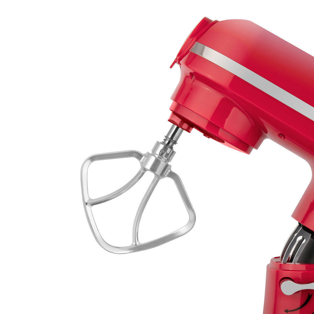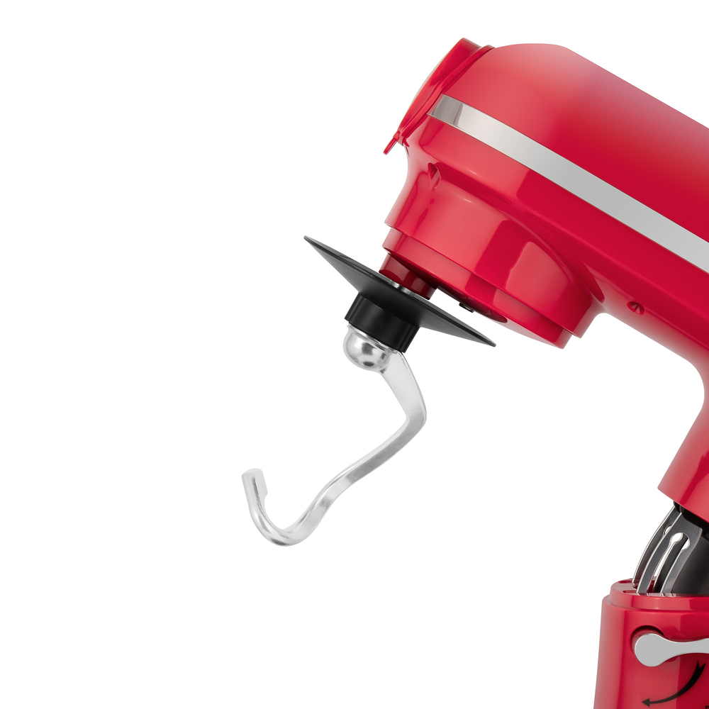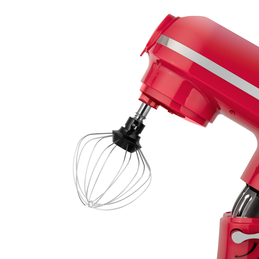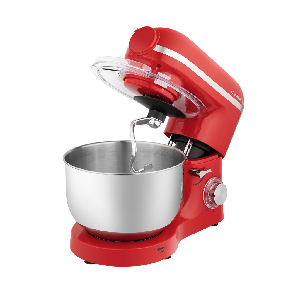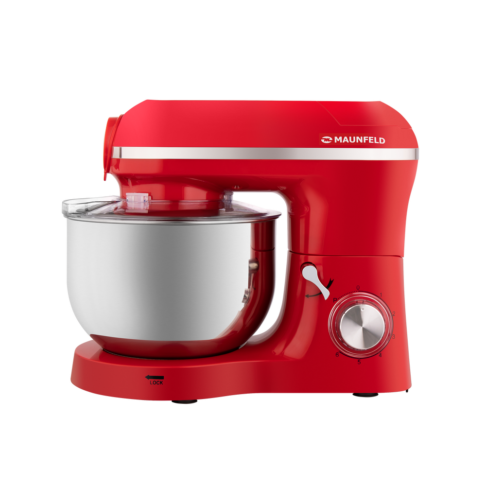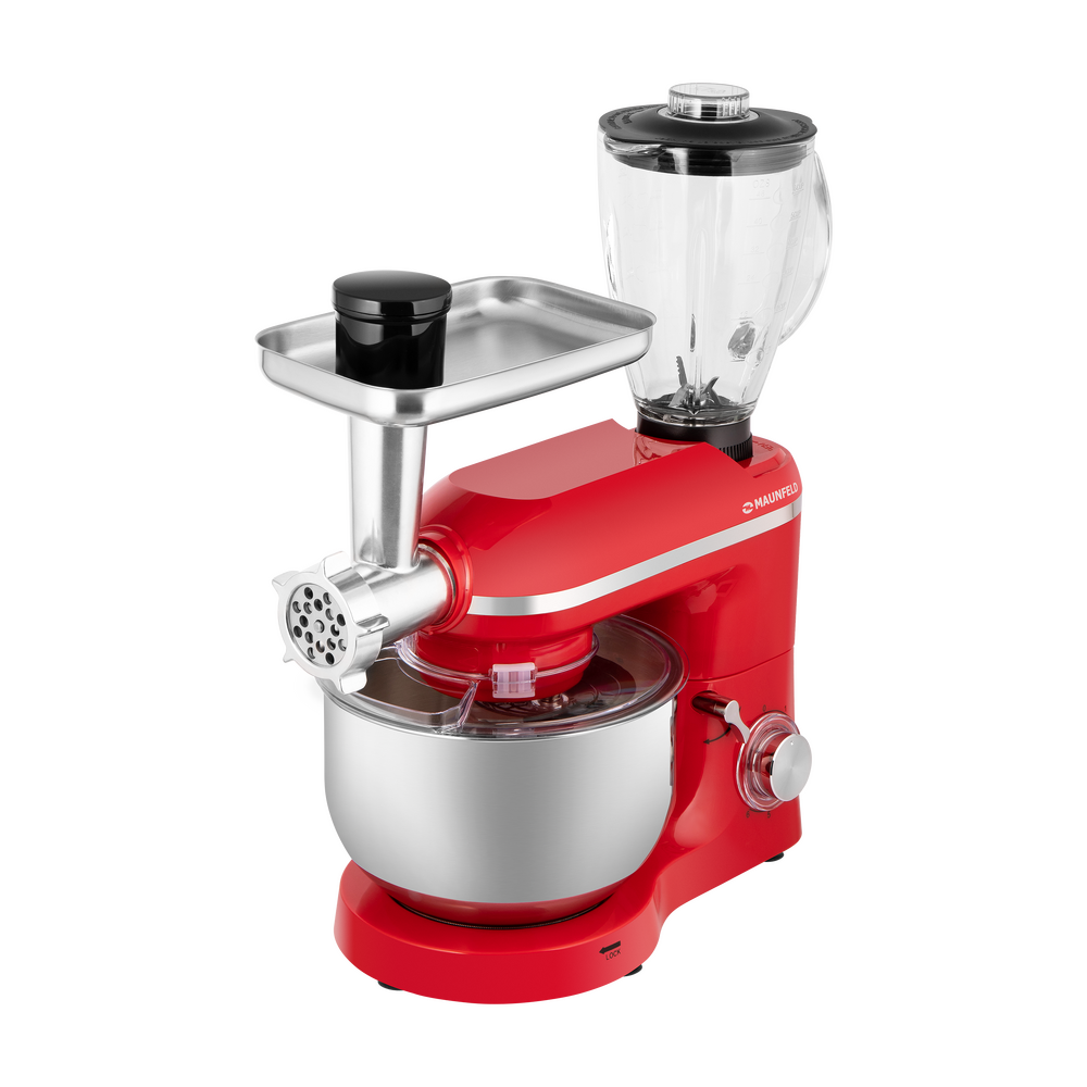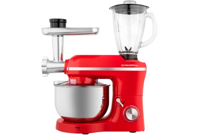 Кухонный комбайн MAUNFELD MF-433CH PRO выполнен в ярком красном цвете, поэтому в интерьер любой кухни он сможет подчеркнуть современный интерьер кухни. Корпус изготовлен из пластика. Этот материал отлично подходит, он легкий по весу, а также прост в уходе. Устройство имеет средние габариты, на большой или средней кухне не будет занимать много места. В высоту — 53.3 сантиметра, в глубину — 23.9 сантиметров, а в ширину — 47 сантиметров. Тип управления, который используется в этом приборе, механический. Пользователь взаимодействует с поворотными переключателями, они вращаются легко, поворачиваются плавно. Такое управление понятно интуитивно, вы сможете без интернета и инструкций разобраться со всеми функциями. С помощью дополнительных приспособлений, которые предусмотрены в комплекте вы сможете готовить блюда разнообразной сложности: от простых домашних смузи до десертов ресторанного уровня. Это венчик, крюк для замешивания теста и лопатка для смешивания ингредиентов. Помочь приготовить бол