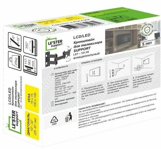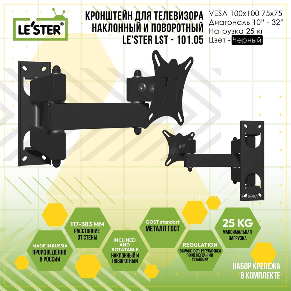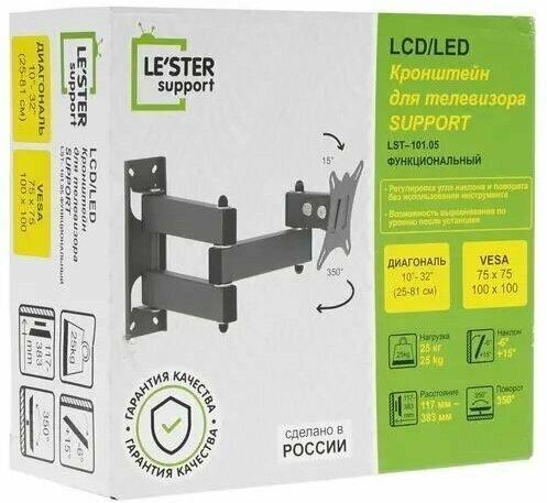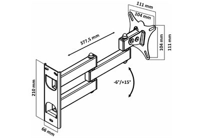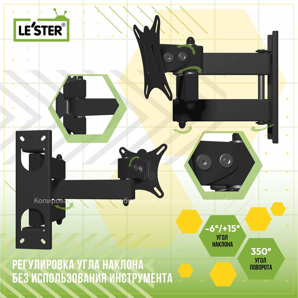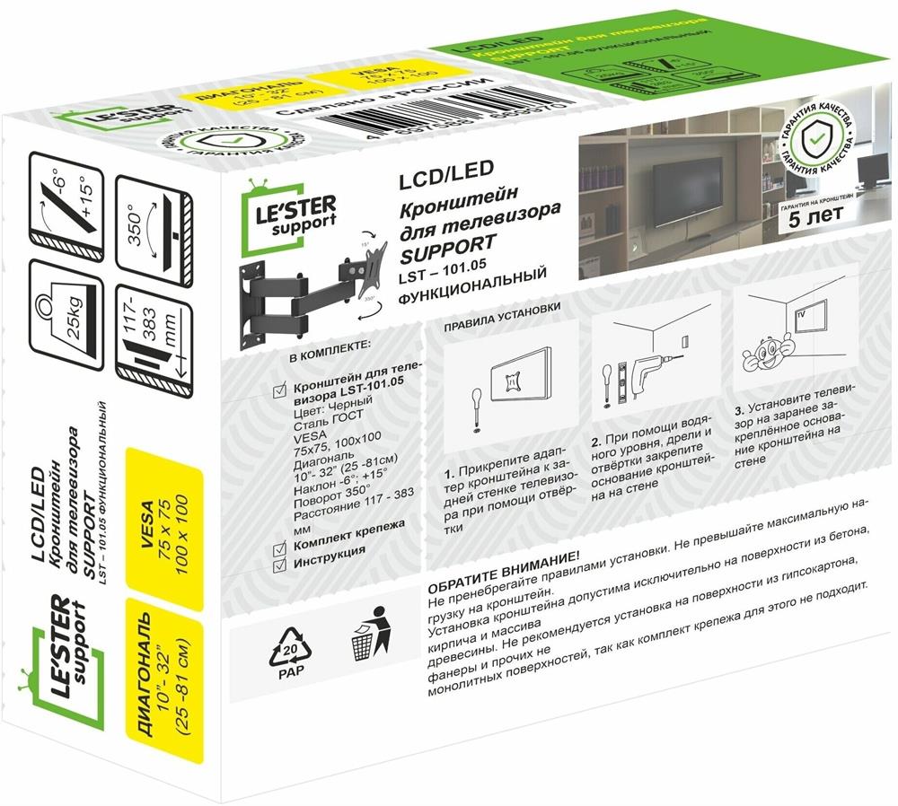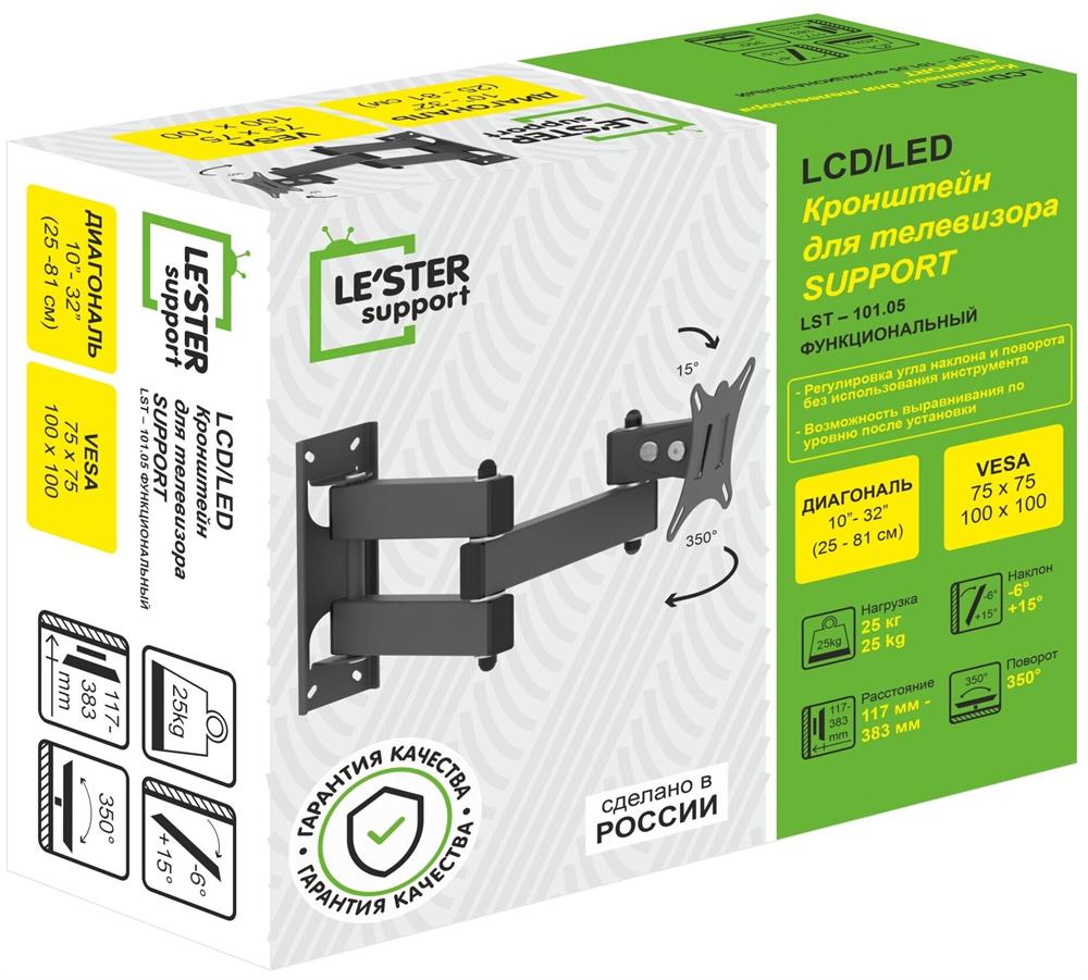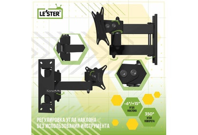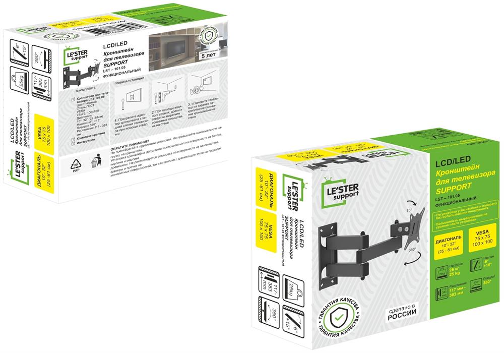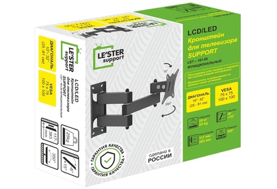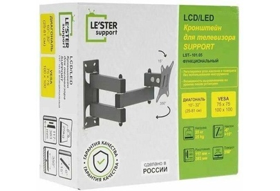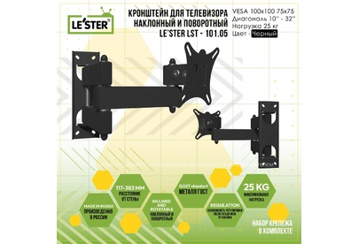 Наклонный-поворотный (Функц) Диагональ: 10"-32" (25-81см) Расстояние от стены: 117-383 мм Угол наклона: -6°/+15° Угол поворота: 350° Нагрузка: 25 кг Толщина металла адаптера 1,5 мм, основания 2 мм. Регулировка угла наклона и поворота без использования инструмента. Vesa 100*100.